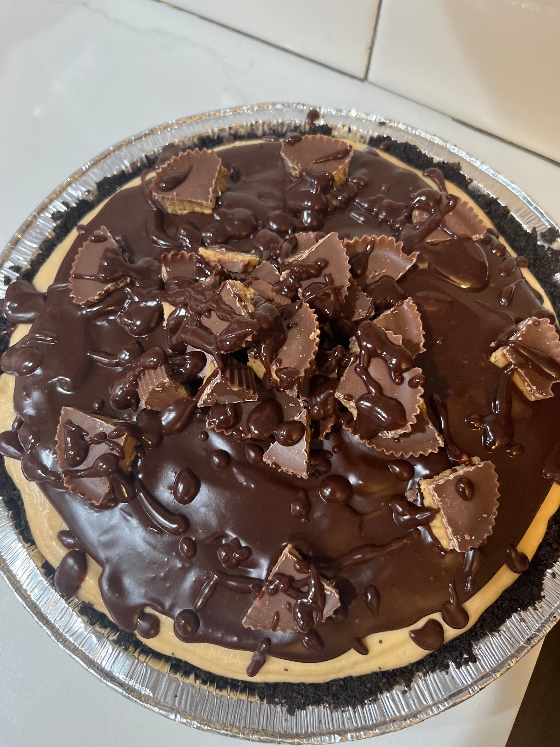The ultimate layering of chocolate crust, peanut butter chocolate cheesecake, chocolate ganache, and a topping of reeces cup